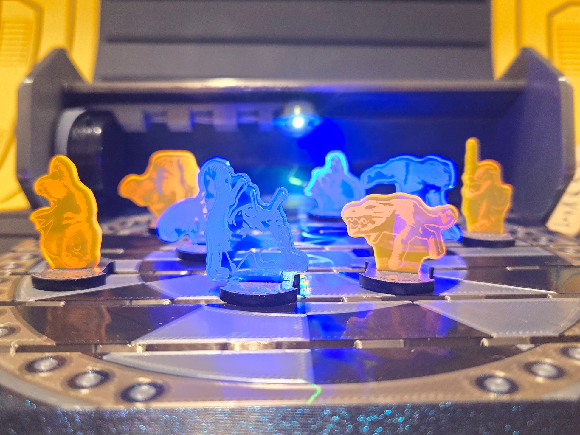 This upgrade brings your Dejarik Travel Set to life, replacing the standard red and blue markers with glowing holo-creatures that come to life under the included illumination unit. Simply peel the backing from the VHB adhesive strip and set the unit into place within the left interior panel of your travel case. The eight included holo-creatures slot into the same bases as your original set, making for a seamless swap from physical tokens to radiant holo-beasts.